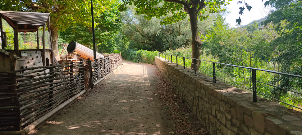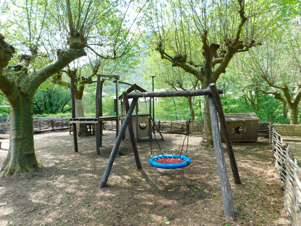 L’aire de jeux a été réfléchie avec une entreprise locale spécialisée dans les accrobranches, et prend appui sur les platanes pour créer des parcours dans les arbres. La clôture s’inspire également du petit patrimoine cévenol. Elle est réalisée en fascines de châtaigner tressées.