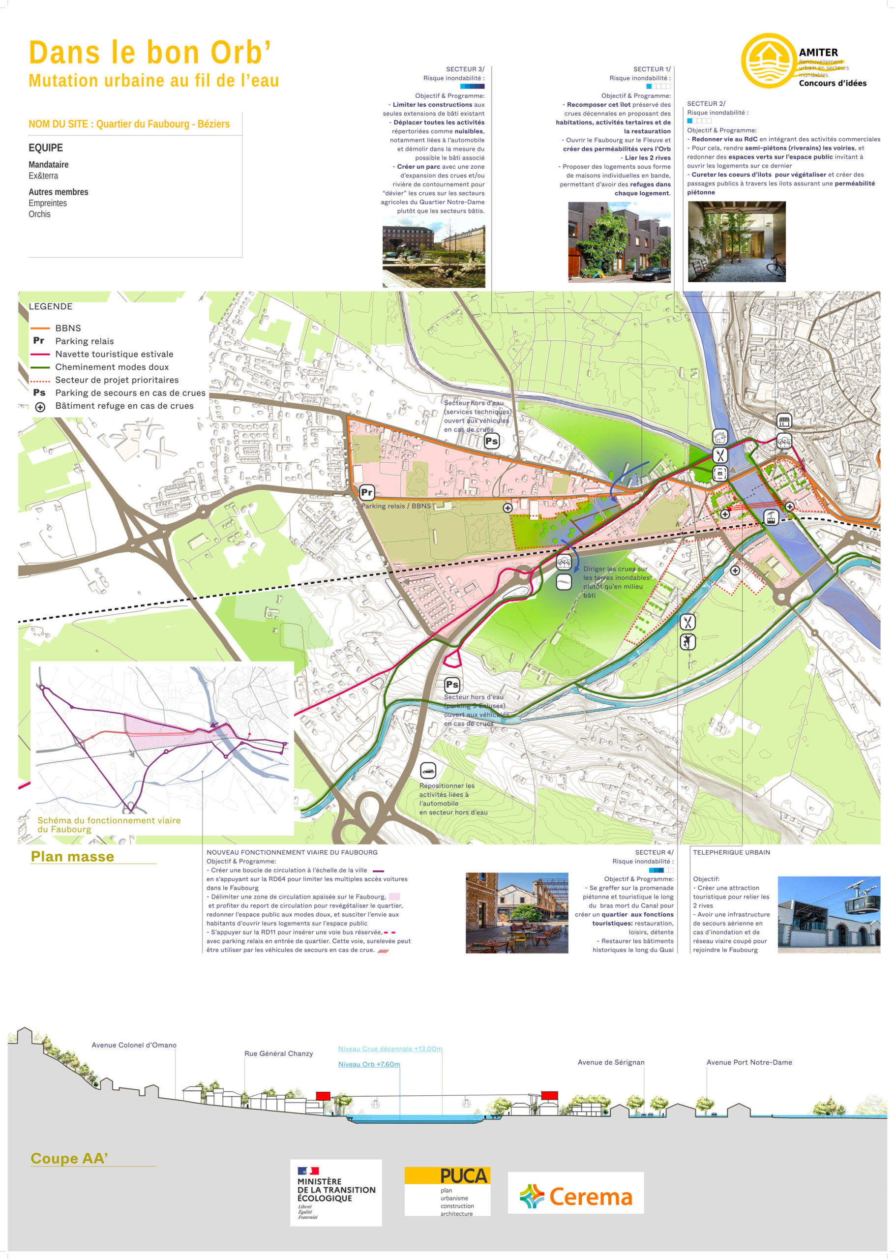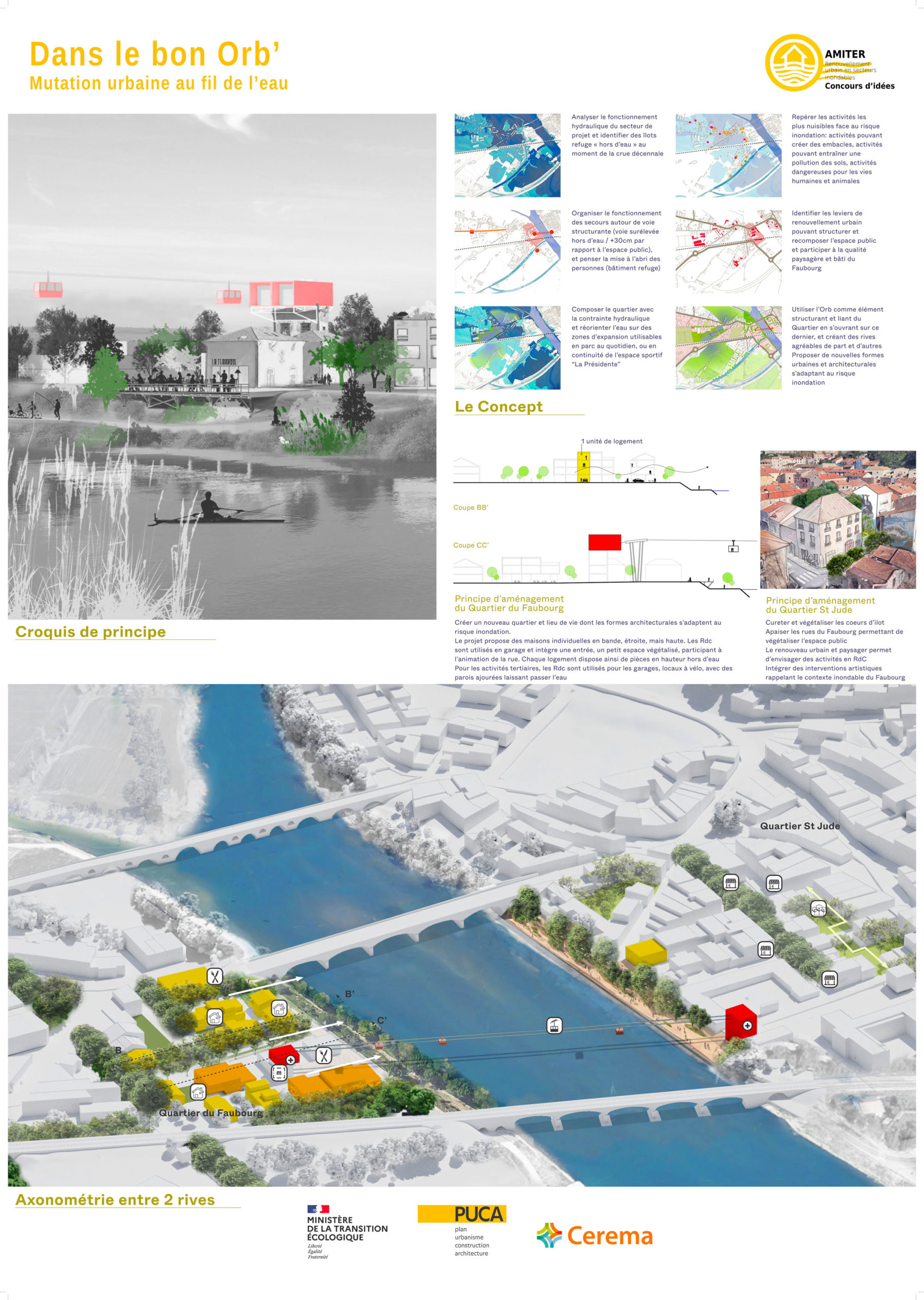 En 2022 le PUCA a engagé des concours d’idées sur plusieurs sites en France exposés à des risques. Notre groupement a travaillé sur le site du Faubourg à Béziers, quartier régulièrement inondé suite aux colères de l’Orb. Lors des crues, le cours d’eau isole le quartier du reste de la ville (souvent pendant plusieurs jours).