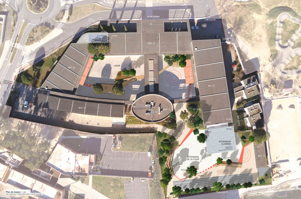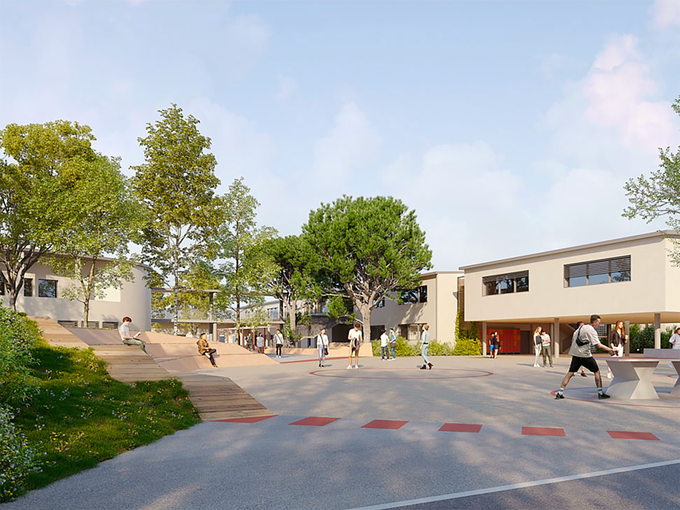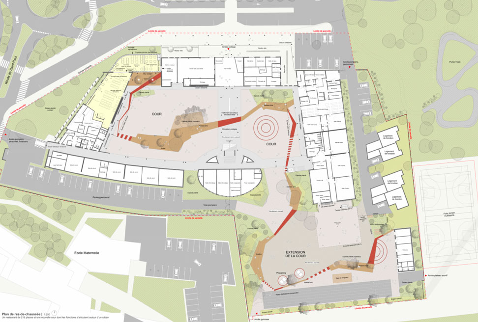 Le projet prévoit à la fois le réaménagement de la cour existante, et la transformation du terrain sportif en cours complémentaire. L’extension de la cour est une formidable opportunité pour les élèves de disposer d’un nouvel espace. L’enjeu est d’arriver à traiter une liaison confortable entre les 2 cours, en travaillant de manière agréable le passage de l’une à l’autre, et en répondant aux enjeux de surveillance. Le nouvel aménagement propose de réunir la cour actuelle et la nouvelle par un « fil rouge » le long duquel viennent s’installer de nouveaux usages : assises, espaces ludiques, scène de théâtre, amphithéâtre extérieur, bibliothèque…