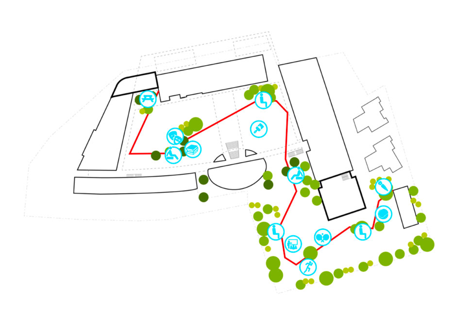 Le fil rouge est accompagné d’espaces de plantations permettant d’ombrager la cour, intégrant les arbres existants.