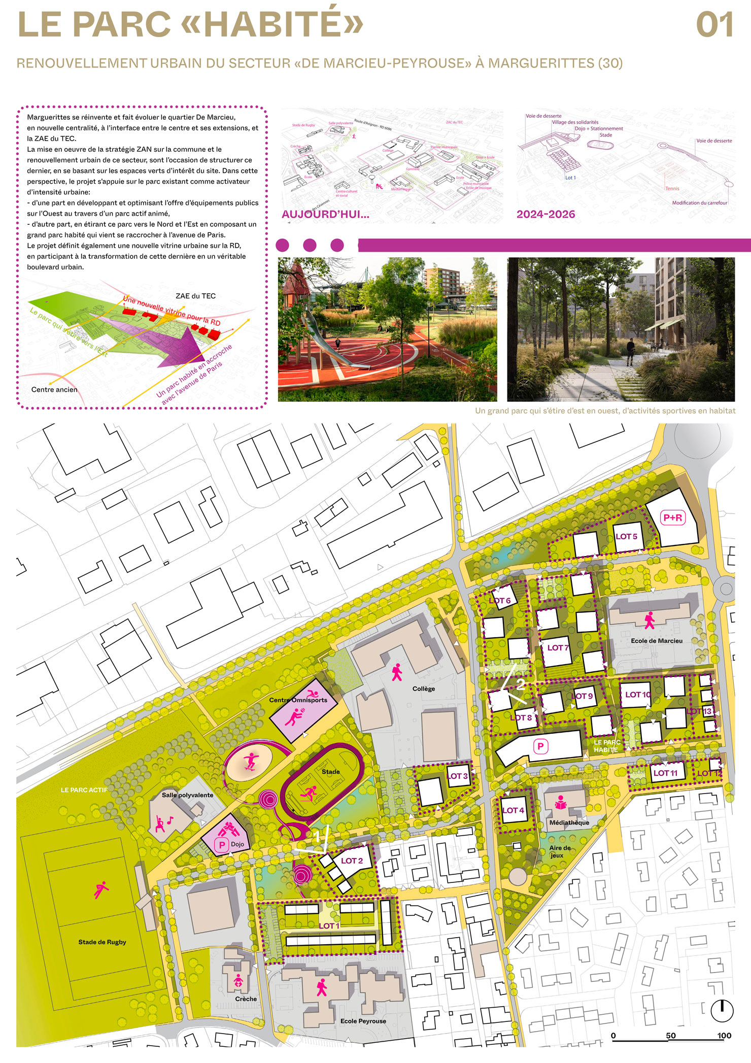 Situé en entrée de ville à Marguerittes, le secteur Marcieu Peyrouse fait l’objet d’un projet de renouvellement ambitieux. Sur un site occupé par des équipements obsolètes et un grand espace arboré, le projet prévoit la création d’un nouveau quartier de 420 logements, en valorisant les qualités existantes et en accompagnant la transformation de la route départementale en boulevard urbain. Inscrit dans la démarche Territoire ZAN, il incarne une urbanisation sobre et durable au service de la commune.