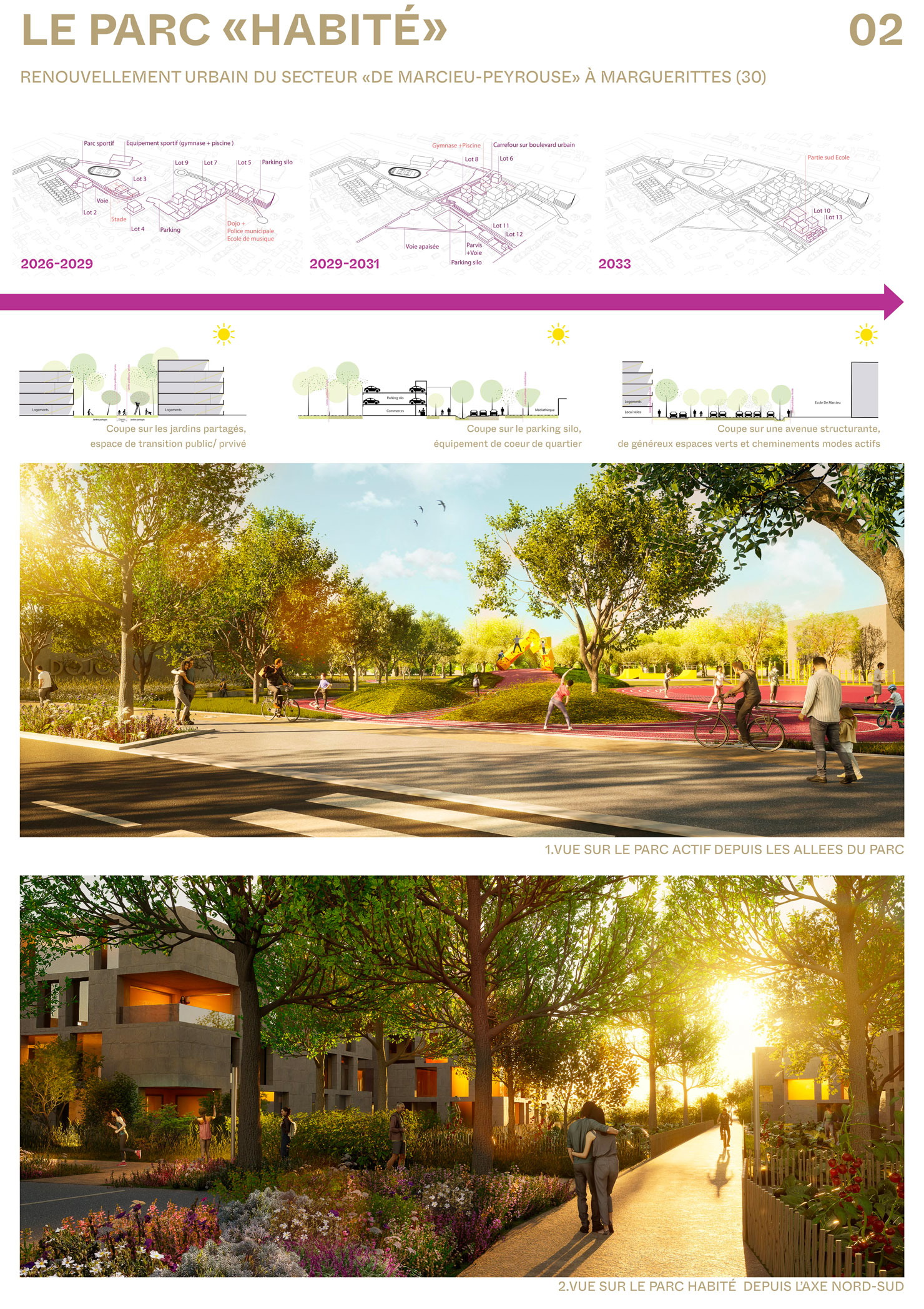 Le projet s’articule autour de la création d’un « parc habité », véritable colonne vertébrale paysagère qui traverse le site d’ouest en est. Ce parc urbain actif structure une densité maîtrisée et hiérarchisée, conciliant développement urbain et préservation des milieux naturels.