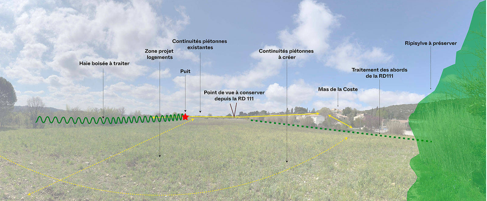 Le PLU de Vailhauquès indique 2 zones à urbaniser selon les besoins en logement :un 1er est en dent creuse à proximité de la polarité principale, le 2nd est en extension à l’entrée ouest du village. Le croisement entre le nombre de logements à envisager sur les prochaines années sur la commune, et la densité minimale attendue par le SCOT du Grand Pic St Loup, invite la Municipalité à engager une réflexion sur le périmètre à urbaniser nécessaire. Il en ressort une diminution de la surface 2AU, mais au profit d’un projet de qualité, préservant la richesse faunistique de la Commune, permettant de continuer le développement du maillage de cheminements doux, développant des formes urbaines adaptées au contexte semi-urbain, et en préservant les franges viticoles.