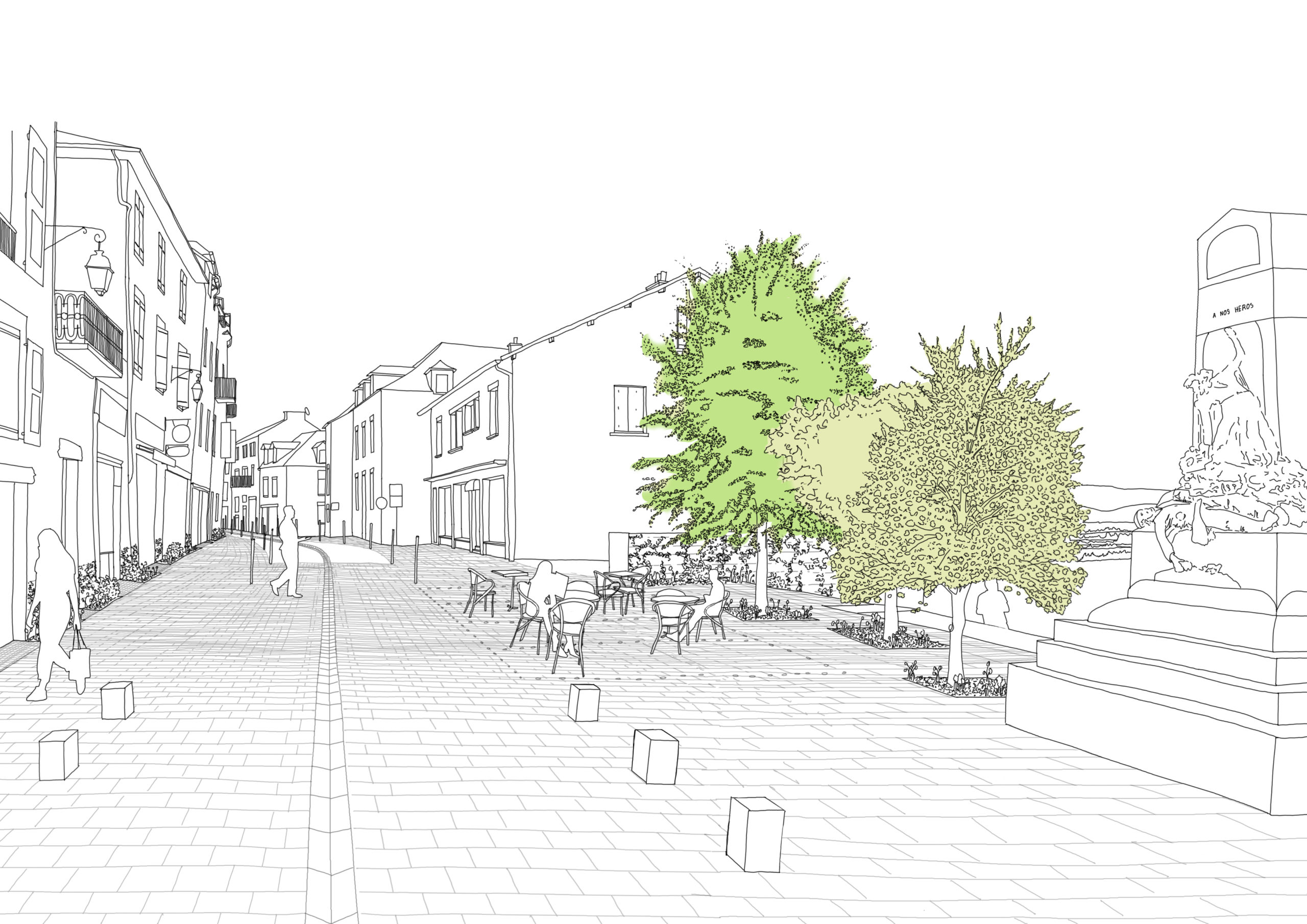 La topographie existante, très prononcée sur ce secteur, nous invite à penser une place à 2 niveaux avec 2 usages distincts.