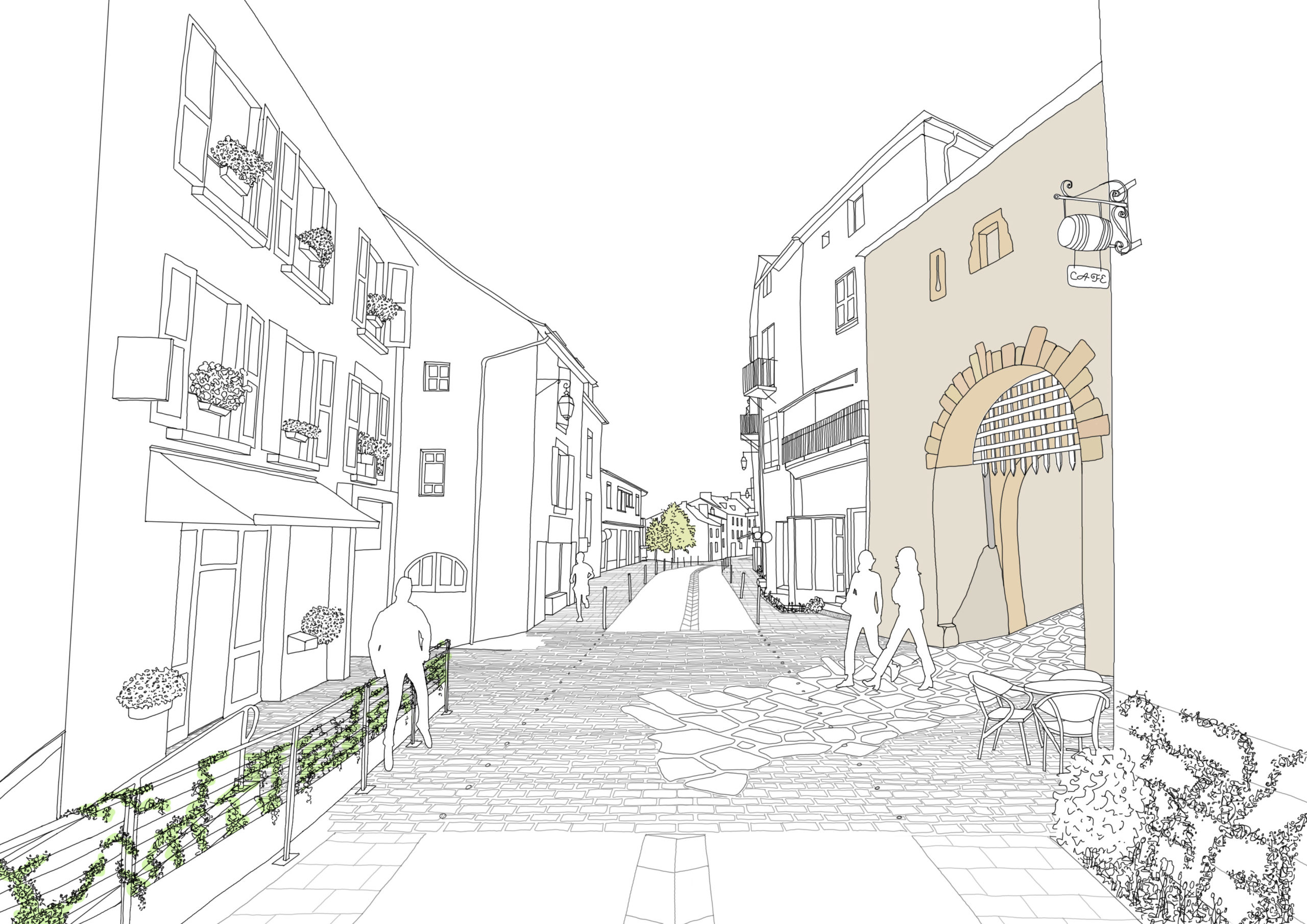 L’aménagement se prolonge jusqu’à la Porte du Peyrou, accès historique à la cité médiévale, avec un traitement qualitatif en pavés, dont une grande partie sont réutilisés de l’existant.