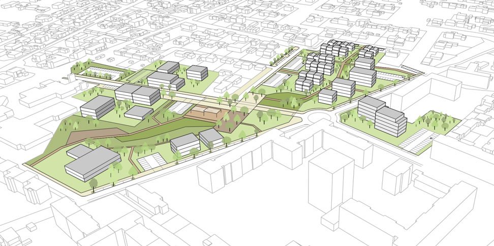 Situé à l’interface entre quartiers pavillonnaires à l’ouest et logements sociaux collectifs à l’est, le projet vise à créer une couture urbaine par une opération mixte et dense, en dialogue avec la diversité des formes urbaines environnantes, tout en affirmant une centralité fédératrice. L’accent a été mis sur la libération maximale du sol, afin de favoriser des espaces communs et conviviaux, notamment à travers la création d’un parc paysager s’étirant du nord au sud et connectant le futur « parc actif » et ses équipements publics.