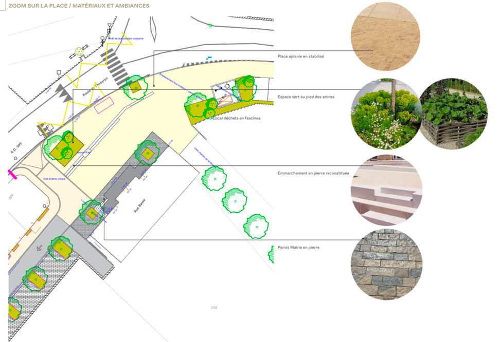 Grâce à un travail sur les sens de circulation, et gabarit de circulation, la place de la Mairie est rendue piétonne. Les platanes existants sont conservés et leurs pieds dégagés et plantés.