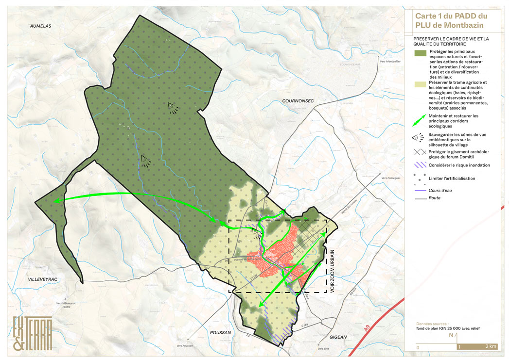 Document test à l’échelle nationale dans la mise en œuvre du ZAN, ce PLU limite strictement l’artificialisation des sols, préserve les milieux fragiles, et permet de mieux préparer les espaces urbains de Montbazin à résister aux problématiques associées au réchauffement climatique (lutte contre les îlots de chaleur urbain, maintien et développement du réseau de nature en ville, infiltration des eaux de pluie...).